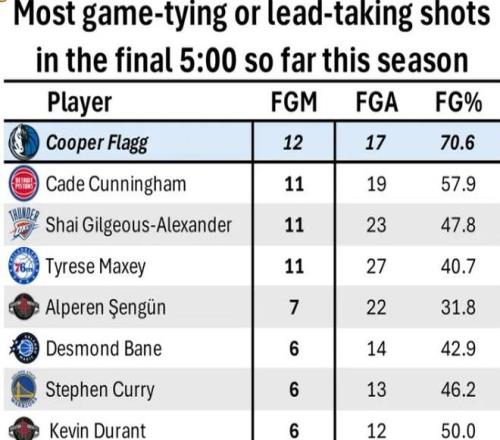 12月17日,美国媒体Extra晒出本赛季,NBA球员最后五分钟投进追平或者反超球的数据!