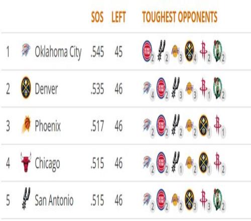 此外,NBA杯赛结束后,雷霆队在19天内打了11场比赛,而不敌黄蜂队的这场球,是他们背靠背的第二场,也是西海岸客场之旅后四天内的第三场比赛。更严峻的是,雷霆队剩余赛程的难度高居联盟首位,对手的平均胜率达到54.5%。
