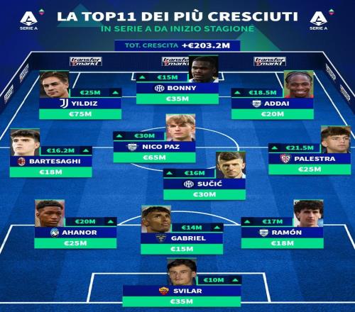意甲身价涨幅最高11人阵容:霍伊伦、伊尔迪兹、普利希奇领衔